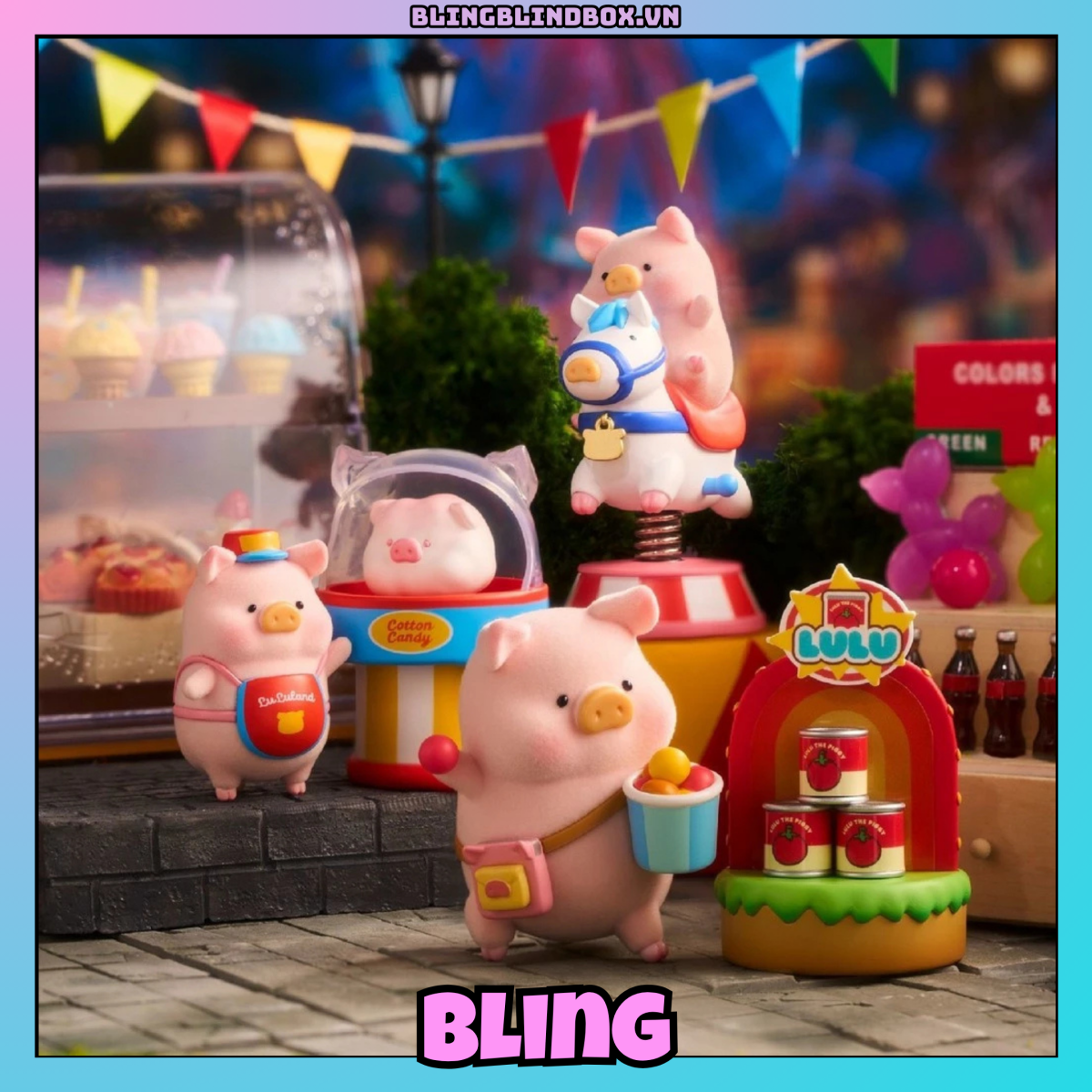 Phong cách thiết kế của dòng này mang đậm tinh thần “mini amusement park” – tươi sáng, năng động, đáng yêu nhưng vẫn giữ nét mềm mại đặc trưng của LuLu the Piggy.
